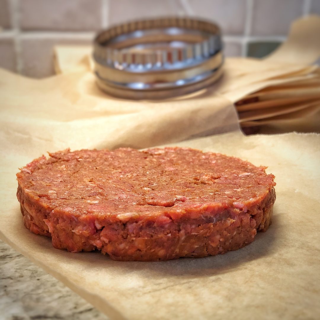 Place a 4.5 inch cookie cutter on one half of the parchment/greaseproof paper and load with 120g of the burger mix